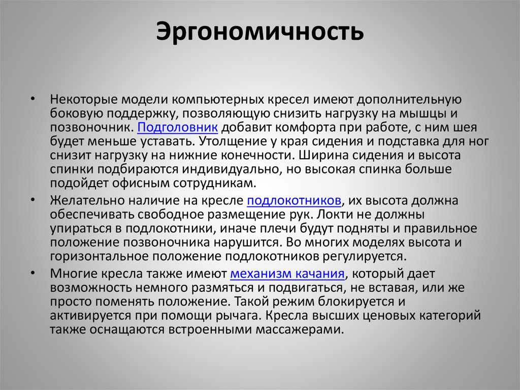 Чтобы считаться эргономичным, кресло должно отвечать следующим критериям: