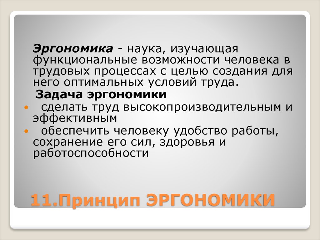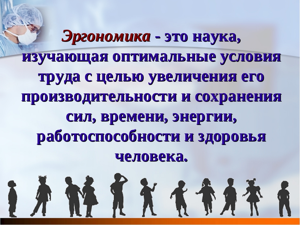 Эргономика — это научное исследование условий труда человека, особенно взаимодействия человека и машины. Эргономика — это термин, взятый из греческого слова «эргон», что означает работа, и «номос», что означает законы природы. Цель эргономики — сделать работу более комфортной и улучшить здоровье и продуктивность. Это междисциплинарная наука о проектировании работы, продуктов и места, подходящих для работника. Психология, промышленная инженерия, информатика, биомеханика и техника безопасности — все это играет важную роль в эргономике.