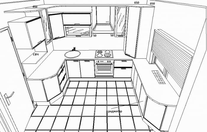 Так же можно использовать это пространство как рабочую поверхность, а шкафы использовать для хранения различной утвари.