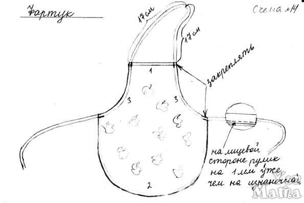 - Пришиваем завязки с двух сторон фартука на расстоянии 20 см от верхней части.