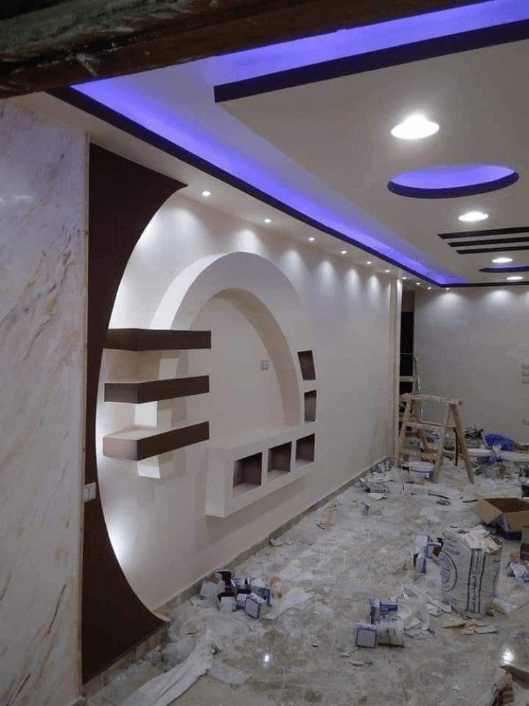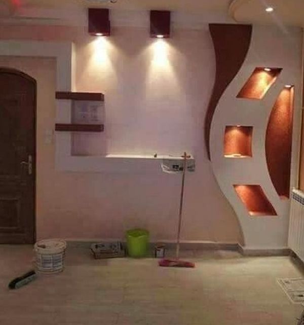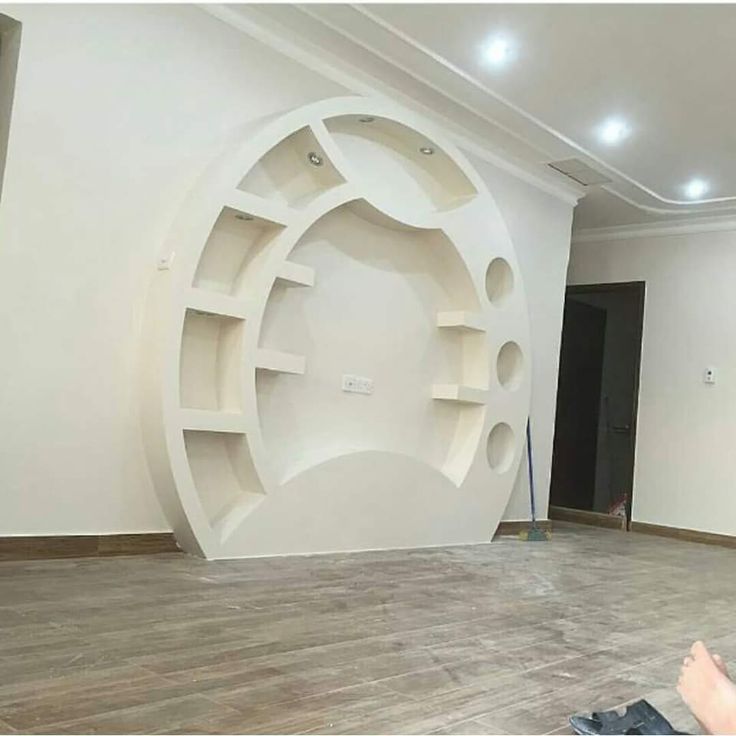 Конструкция на стене из гипсокартона Фигуры могут составлять целые композиции, в которые входят полочки, ниши, арки из гипсокартона, оригинальные рисунки. Некоторые мастера способны воссоздать на плоскости фрагменты известных картин.