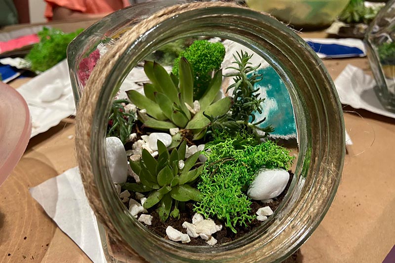 Изображение флориста, показывающего мастер-класс по созданию флорариума из камней и суккулентов в стеклянной банке.