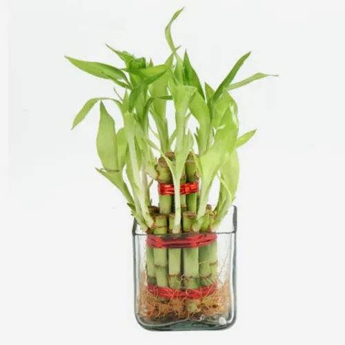 Выращиваемый в воде бамбук отличается гармоничным развитием, его высота может достигать 80-200 см. Такое растение очень просто растить в группе, связанные лентой стебли отлично смотрятся в любом интерьере.