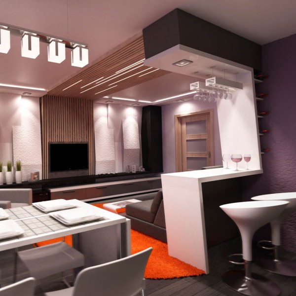 - бар может стать ярким акцентом любого интерьера. При правильном размещении этого элемента дизайна вы сможете выделить главную зону комнаты;