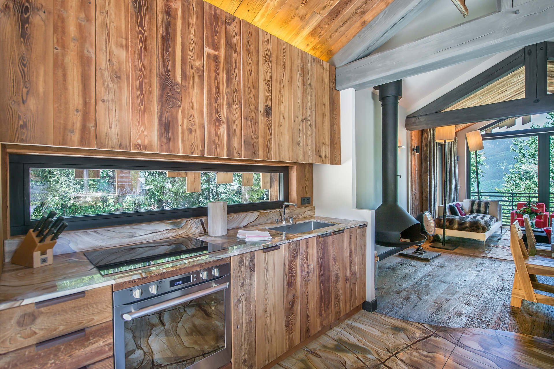 Кухня в стиле шале — воплощение простоты и неприхотливости. Этот стиль зародился во французских Альпах, когда пастухи, загнав на лето свои отары, строили себе дома для отдыха. Они построены из того, что было, поэтому в этом стиле преобладают камень и дерево, грубая обработка.