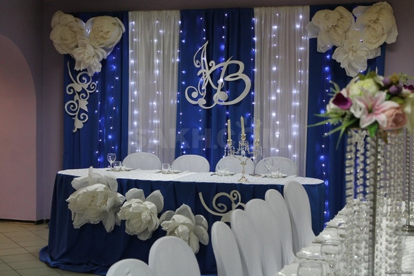 Организаторы подбирают светлое и уютное помещение. Проводят отделку тканью белого и голубого оттенка.