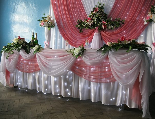 Выглядит богато, располагается в центре, выделяется визуально на фоне всего интерьера. Стол украшают крупными цветочными композициями, парными бутылками шампанского, декорированные столовые приборы.