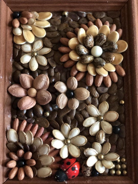 Особенно красивыми получаются поделки, в которых тыквенные семена сочетаются с другими видами природных материалов — семечками подсолнечника, листьями или цветами.