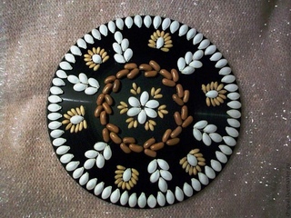 На неё клеят тыквенные семена рядами, двигаясь от окружности к центру. Таким образом заполняют четыре ряда. Обязательно оставьте местечко для сердцевины. Переверните заготовку обратной стороной и приклейте ещё один ряд по кругу.