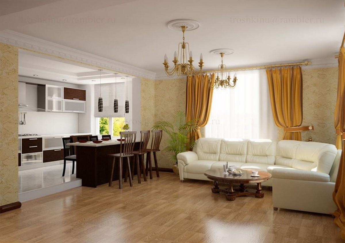Правильно оборудованная гостиная, совмещенная с кухней, не должна сливаться в единое помещение.Несмотря на то, что используется одно пространство, функциональные зоны в нем должны быть четко отделены друг от друга.