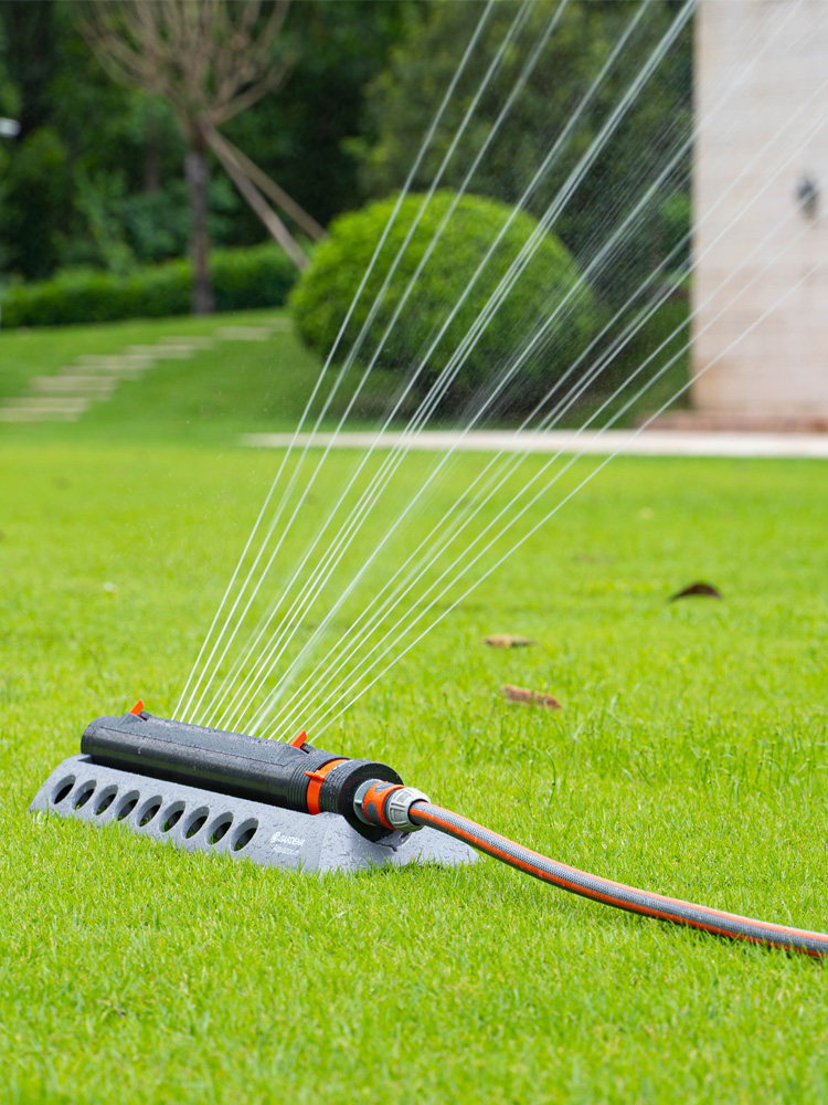 Качающийся или осциллирующий дождеватель придуман специально для полива газонов прямоугольных и квадратных форм. Устройство позволяет настроить дальность и степень полива.