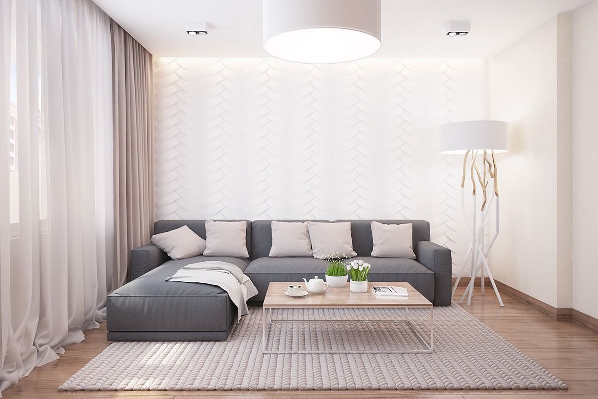 Обои с рисунком или без, стены под покраску, декоративные панели, различные вставки — современный интерьер гостиной в светлых тонах богат возможностями.
