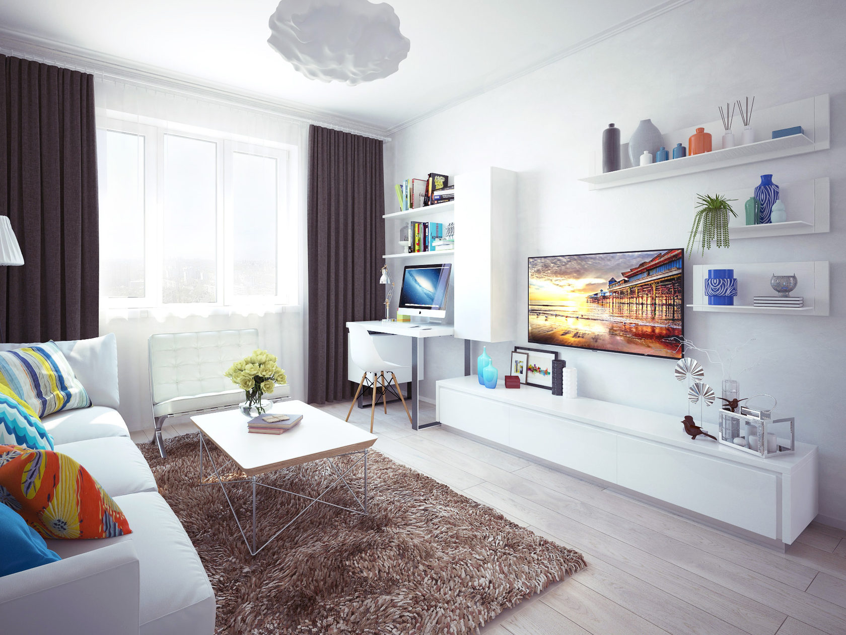 Великолепно смотреться в белой гостиной будут акценты на шкаф и диван, которые предпочтительны более яркой расцветки. Остальное оформление при этом должно быть лаконичных тонов.