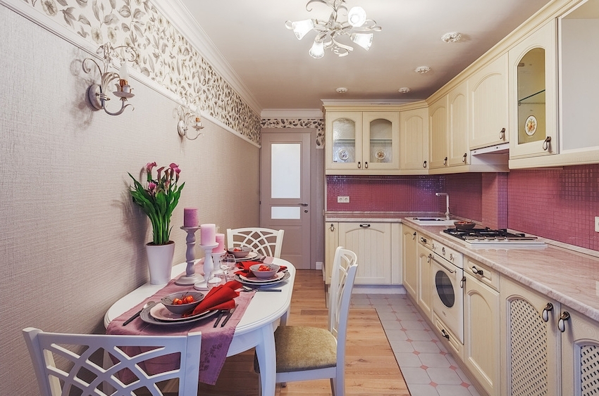 Кроме того, в интерьерах кухни все чаще можно увидеть обои светлых оттенков: в их положительном воздействии на восприятие размеров комнаты и степени ее освещения убедились уже многие покупатели, поэтому светлые тона настенных покрытий пользуются большей популярностью, чем мрачные оттенки.