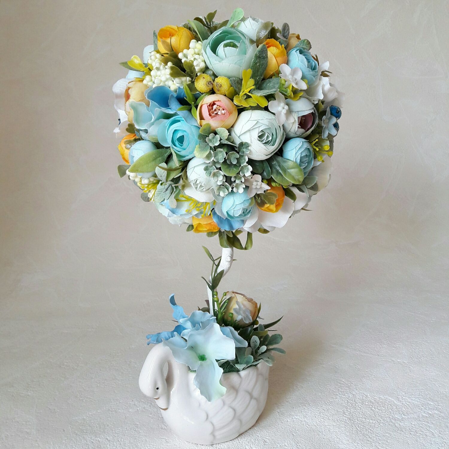 Топиарий (англ. Topiary handmade) — это декоративное дерево счастья, символ богатства и процветания в доме. Используется в дизайне интерьера, распространен в странах Европы. Строение топиария — горшок, ствол и шар: никаких ограничений по техникам или материалам! Однако общие правила по композиции, сочетанию цветов и пропорциям рекомендуем соблюдать. Далее подробно, как сделать дерево счастья и какие материалы можно использовать.