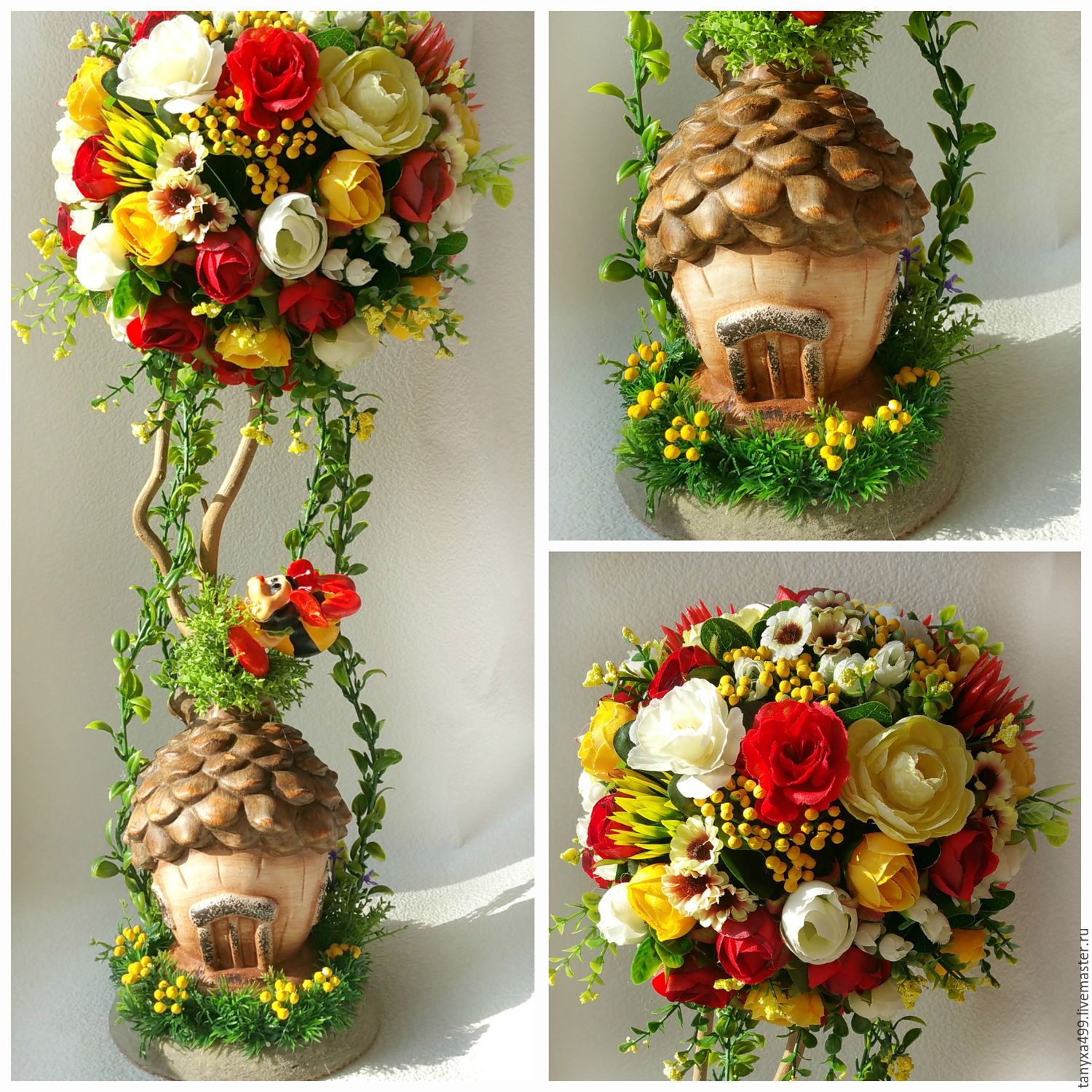Крона — на пенопластовом шаре с обмоткой тканью. Топиарий посажен в отреставрированный старый горшок, залит гипсом со щебнем. Мастер-класс от Алены Тихоновой в видео формате, а также в виде пошаговой инструкции с фото.