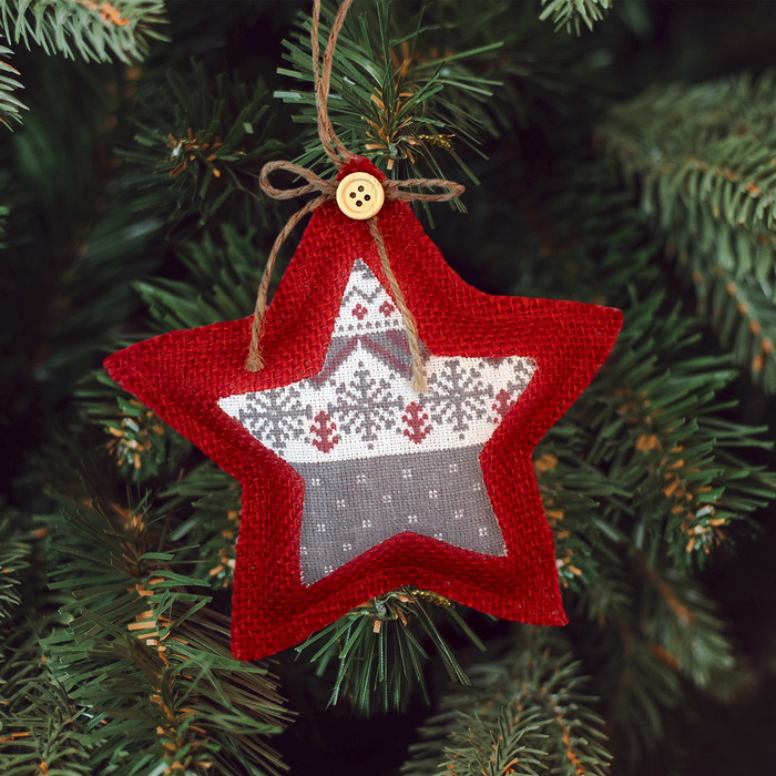 Детали такой новогодней игрушки совсем не обязательно контрастны. Бывает, близкие по цвету ткани, но с разной крупностью рисунка, дают больший эффект. Украшения нужны минимальные: лента, бусина, пуговица. Традиционные формы: шестиконечная звездочка и шарик.