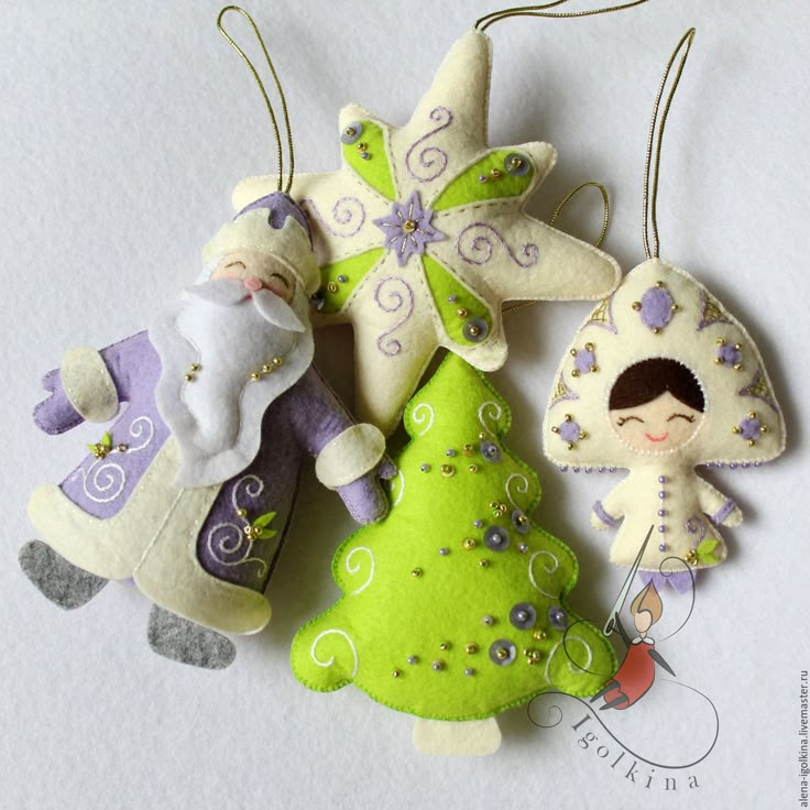 Из фетра вручную создают маленькие шедевры, от которых лесная красавица становится доброй и милой новогодней волшебницей. Крупные стежки, шов «через край», яркие тёплые цвета ткани, контрастная отделка игрушек из фетра очень хорошо сочетаются с холодной хвоей.