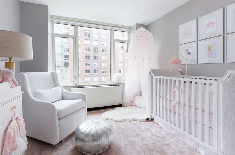 На фото современный интерьер детской для новорожденной девочки, выполненный в белых и пастельно-розовых тонах.