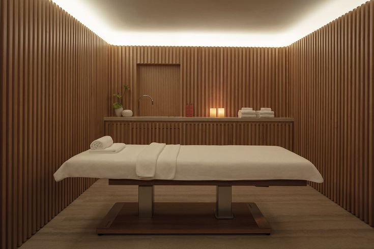 Стильный интерьер массажного кабинета со спа-столом в салоне.