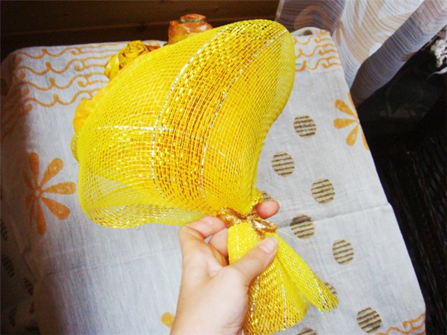 Теперь ножка. Мы берем более узкий кусочек сетки и по спирали обматываем им ножки цветов, затем перевязываем лентой снизу.