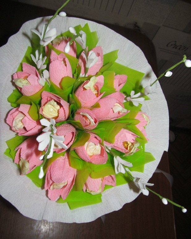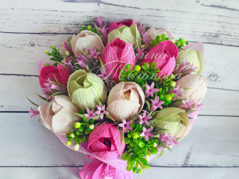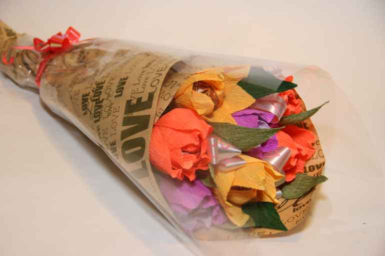 имеющейся упаковки, а гофрированная бумага должна дополнять цветы.
