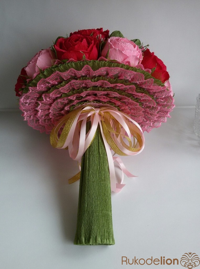 - Заключительный штрих — прикрепить к основанию букета бант, если это необходимо, или красивую ленту.