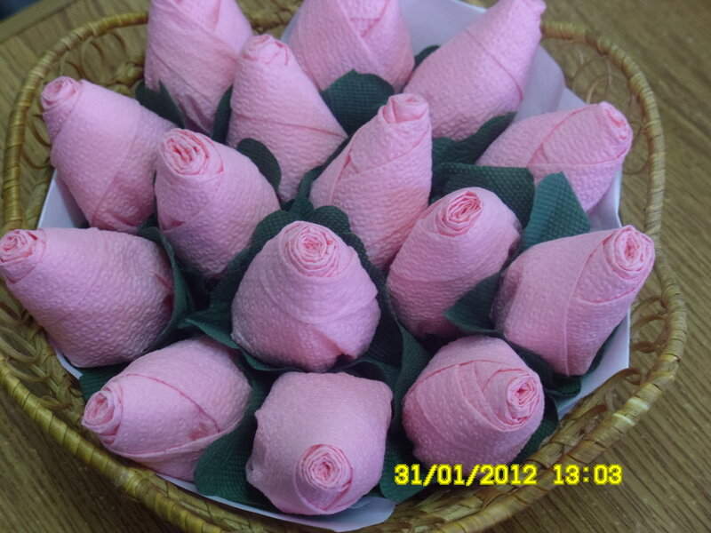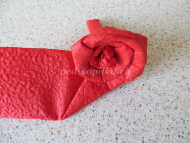 Над королевой цветов — розой — придется потрудиться немного дольше и сноровка понадобится. Особенно, если вы собираетесь делать целый букет из роз своими руками. Для цветка понадобится полоска из салфетки, желательно однослойной. Ее нудно обернуть вокруг пальца, так чтоб сформировался бутон. Вокруг его основания начинаем накручивать слой салфетки другого цвета для стебля. Затем потяните край салфетки в том месте, где должен быть листик.Еще один способ изготовления розы показан вот в этом видео.