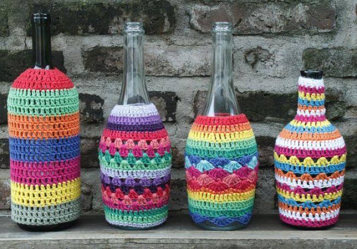 Чтобы красиво обвязать бутылку, подойдут остатки пряжи, оставшиеся от вязания одежды, или ненужные вещи, например, можно распустить для нового чехла надоевший свитер или кардиган.