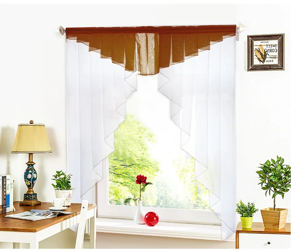 Дополняются они прозрачным либо узорчатым тюлем. Его можно вешать как на верхний карниз, вместе с полотном ткани либо же посредине на струну, как в вагоне поезда. При желании можно ограничиться самим тюлем, выбрав достаточно плотный рисунок.