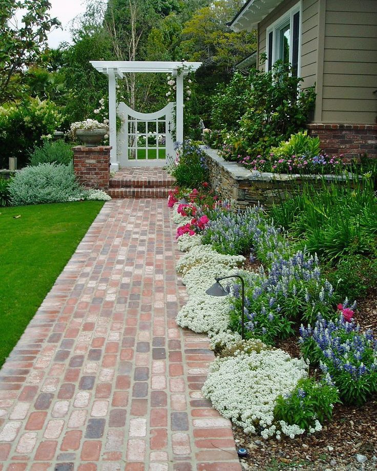 Если вы сумеете соорудить конструкцию навеса, ведущую от калитки к дому, вокруг которой высадите вьющиеся цветы, они плотно оплетут каркас и создадут натуральный навес, способный защитить от пыли, знойной жары и даже удержать капли дождя.