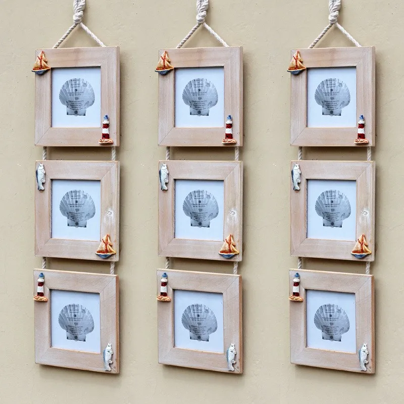 Если вам лень развешивать каждое фото отдельно, вот вам вариант с полочкой. Сделайте тонкую полку из доски и реек, закрепите ее на стене и установите туда фотографии.