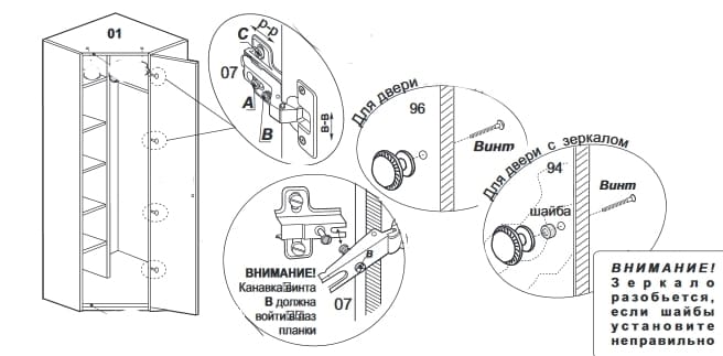 По левой боковой поверхности шкафа настраивается левое полотно двери, а по правой стороне – правое. При регулировке двери должны находиться в закрытом состоянии.