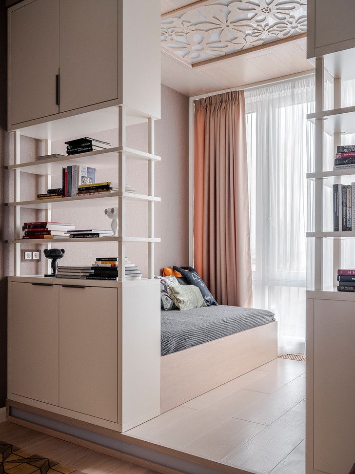 В небольших квартирах часто возникает необходимость разделения гостиной на зал и спальню. При организации пространства очень важно сохранить баланс, не загромождать пространство, но скрыть при этом кровать.