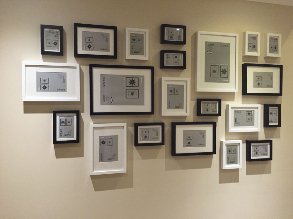 - Фото одного формата в одинаковых рамках, выстроенные ровными рядами, выглядят тоскливо, словно кильки в консервной банке.