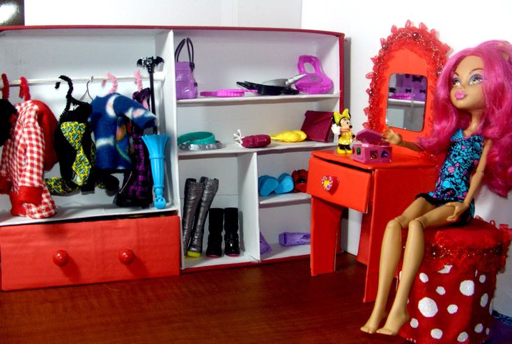 Коробка из-под обуви в умелых маминых руках станет основой, а полочки с дверками легко нарезать из картона или крышки коробки. Для куколки побольше в качестве гардеробной системы можно использовать гофрокороба. Они уже имеют «дверки», остается установить короб в нужное положение, вклеить картонные полочки, прикрепить ножки. Выдвижные ящички делаются из коробки поменьше. После этого останется только прикрепить ручки из проволоки, вставить отсеки в шкаф.