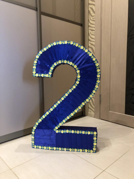 Шаг 3. Теперь необходимо склеить вместе цифры и полоски. Сделать это просто можно при помощи декоративного скотча. Приложите каждую полоску к фигуре под прямым углом. Место соединения двух заготовок скрепите скотчем. Повторите это действие по всему краю цифры. Затем приложите вторую двойку и приклейте к полоскам, но с обратной стороны. У вас должна получиться полая фигура в виде двойки.