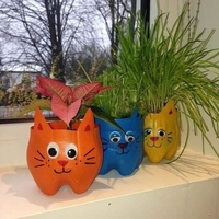 Бутли окрашиваем снаружи или изнутри (налив немного краски и поболтав бутль, получим полностью окрашенные стенки и дно емкости). Глаза вырезаем из пластика и закрепляем в отверстиях-прорезях.