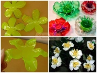 Для головки цветка берем донышко от бутылки и вырезаем на нем 5 лепестков. Подержав над огнем, получаем лепестки с изгибами. Серединку делаем так же. Эффектнее получится цветок, у которого лепестки и серединка сделаны из пластика, отличаюшегося по цвету.