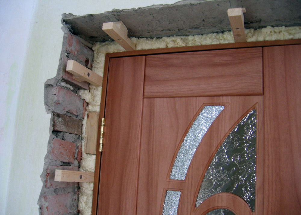 Категорически запрещается разрезание кирпичей. Это существенно ослабит все перегородку, может привести к появления трещин или обрушению.Ряд кирпичей, находящийся над верхней точкой дверного проема демонтируют и заменяют на балку или брусок, превышающие по ширине дверной проем