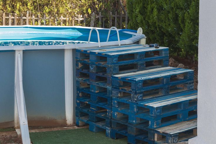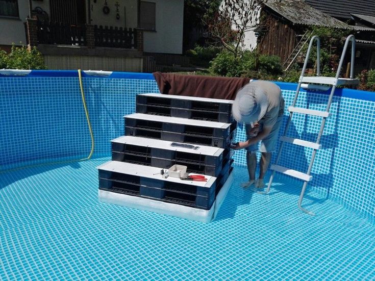 Строительство палубы рядом с каркасным водоемом выглядит даже проще, чем в предыдущем случае. Подиум можно собрать в виде длинных и широких ступеней, зашитых дощечками, или же, как в случае, приведенном на фото ниже, просто сложить и сбить из целых поддонов два яруса.