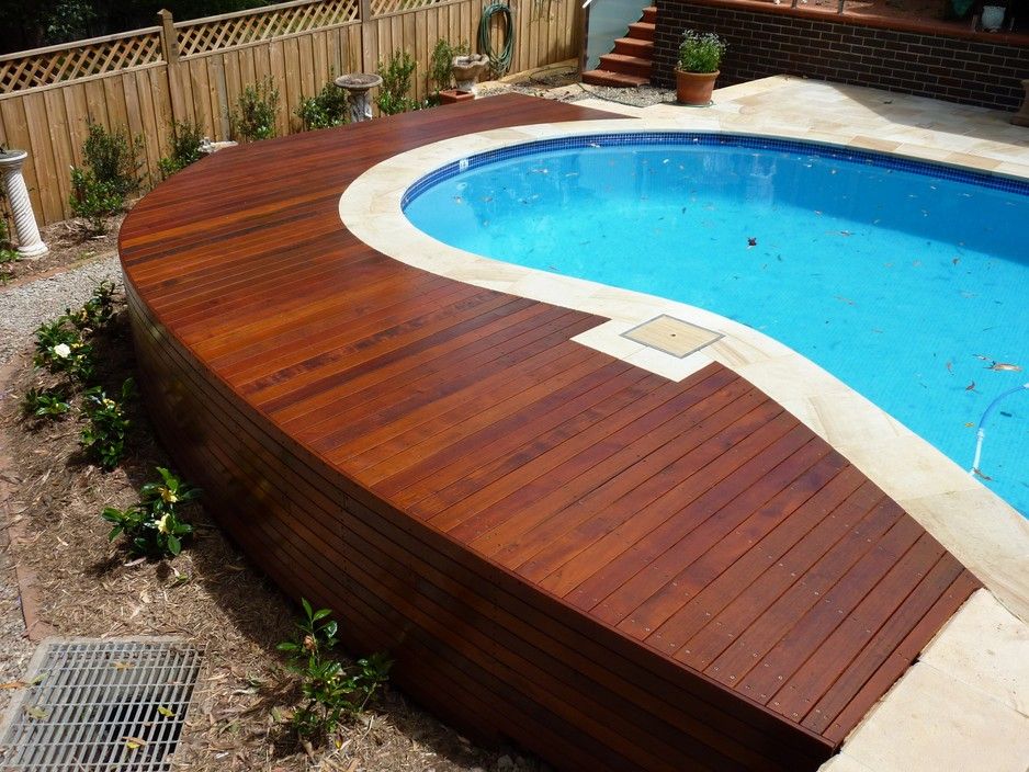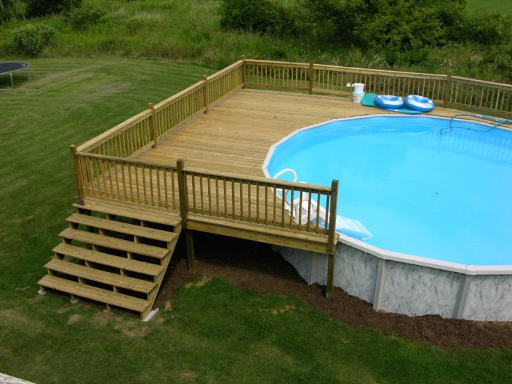 Лучше всего строить подиум для дачного бассейна из террасной доски, она обладает отличными декоративными и тактильными качествами, высокой стойкостью к влаге; - Для изготовления используются только металлические и деревянные опоры, никакого пластика, кирпича и бетона.