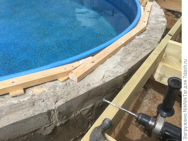 Делается это для того, чтобы подиум под нагрузкой при ходьбе по ступенькам не отошел от чаши бассейна. Уложенные бруски связываются с каркасом полипропиленовыми хомутами, также в грунт возле каждой секции нужно забить колья на глубину 20-25 см, и связать их с брусами обвязки, для того чтобы ограничить колебания или небольшие перемещения под нагрузкой.