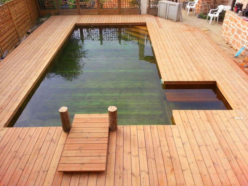 Лучше всего строить подиум для дачного бассейна из террасной доски, она обладает отличными декоративными и тактильными качествами, высокой стойкостью к влаге;