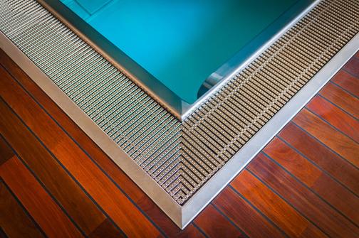 Полотно укладывают также на горизонтальную поверхность подиума. Оставлять древесину без отделки не имеет смысла, под воздействием солнца и влаги доски очень быстро покроются трещинами. Ступени облицовывают отдельными кусками полотна, так, чтобы любая вода, попавшая на лестницу, могла беспрепятственно стекать на грунт, в щели между ступенями.