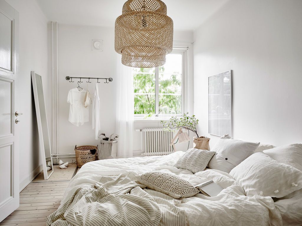Спальня в скандинавском стиле, оформленная в белых тонах