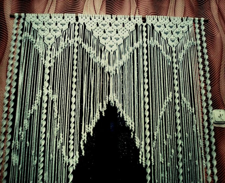 Шнуры к основе прикрепляют с помощью саморезов. Можно на каждом сверху закрепить кольцо и собрать конструкцию на шторном карнизе. Дополняют вязаными или деревянными деталями.