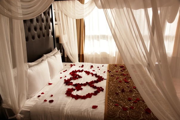 Комнату молодоженов и их кровать нужно украсить лепестками роз.