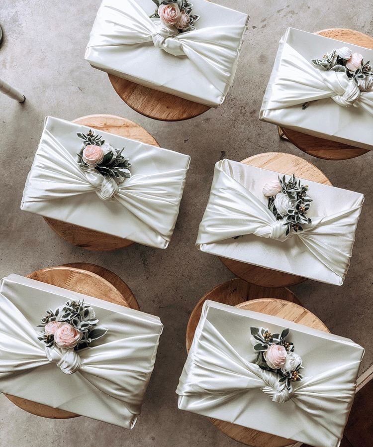Фуросики — это традиционная ткань для упаковки, которую японцы используют для доставки товаров и подарков. Эти ткани обычно имеют квадратную форму и сделаны из хлопка, шелка, нейлона или полиэстера. Фуросики бывают самых разных дизайнов, но популярны и простые. Эта идея упаковки свадебного подарка не только практична, но и устойчива — получатели подарка могут перепрофилировать эту ткань или повторно использовать ее для другого подарка.