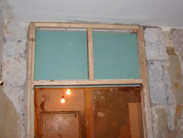 Есть несколько вариантов решения вопроса. Можно до установки двери, построить каркас из деревянного бруса или металлопрофиля и нашить на него гипсокартон. Можно сначала установить дверь, а потом уже построить каркас, задействовав при желании верхний брус коробки, и опять же нашить гипсокартон. Затем саморезы на гипсе, либо весь гипс, шпаклюются, стык гипса со стеной также обрабатывается шпатлёвкой. И в результате мы имеем продолжение стены на вид ничем не отличающееся от своих более полноценных и натуральных собратьев.